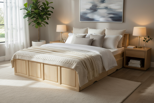 Дървено легло ГРАНИТ със скосена ракла + гръб + чекмеджета