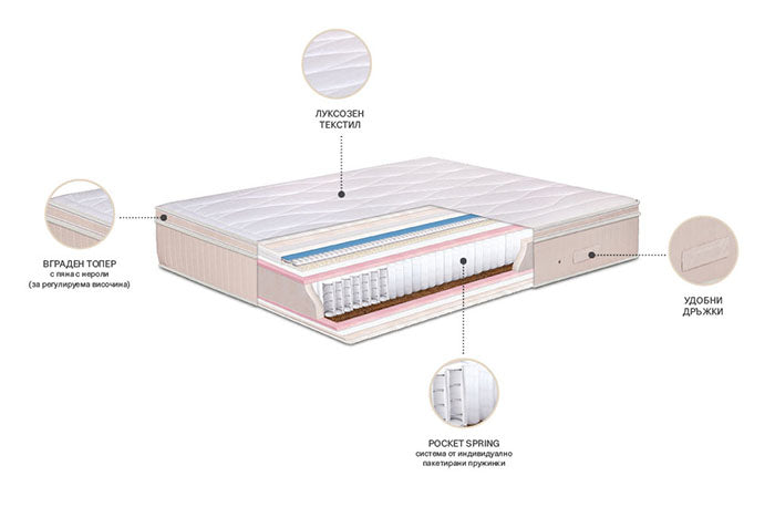 Матракът е обогатен с иновативни технологии, включително топ матрак с хибридна конструкция от перфориран латекс, омекотена пяна и nanopocket пружинки. Този топер може да се обръща и отстранява, предоставяйки възможности за персонализация. Допълнително удобство е добавено чрез удобните дръжки за пренасяне.
