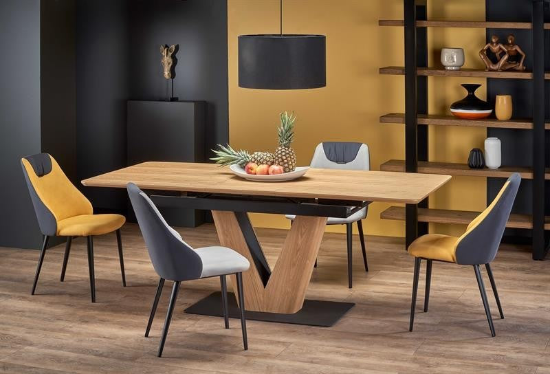 Трапезна маса Umberto съчетава изтънчен дизайн и практичност, подходяща за съвременния дом. Разтегателният механизъм със синхронно действие осигурява лесно разширяване, за да посрещнете повече гости. Плотът е изработен от МДФ с естествен фурнир и МДФ лак в цвят натурален дъб, който внася топлина и естествено излъчване. Здравата метална основа, прахово боядисана в черен цвят, добавя модерен и стилен акцент, гарантирайки стабилност и дълготрайност.