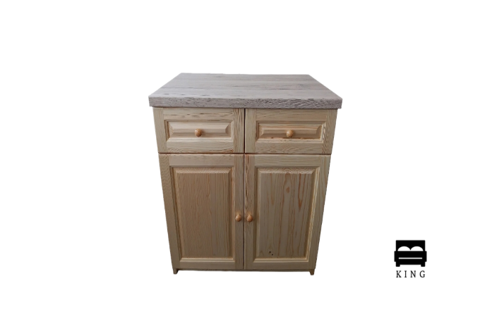 Изработен от масивно чамово дърво в бежов цвят, шкафът предлага не само визия, но и здравина. Термоплотът от дъб в сив нюанс е устойчив на топлина, влага и механични въздействия – идеален за интензивна употреба.