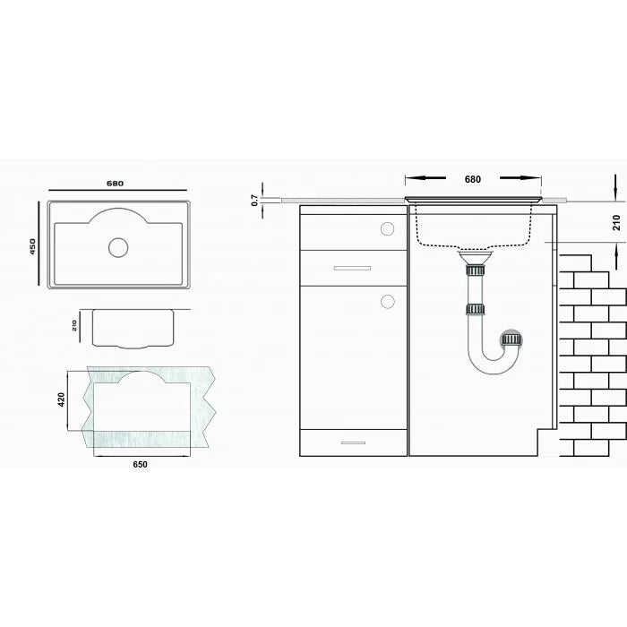 Тази голяма мивка от алпака (неръждаема стомана) с външни размери 680x450 мм предлага изключителна дълбочина от **210 мм**. Това е професионален стандарт, който Ви позволява лесно да миете големи тави и тенджери, като същевременно елиминира пръскането извън коритото.