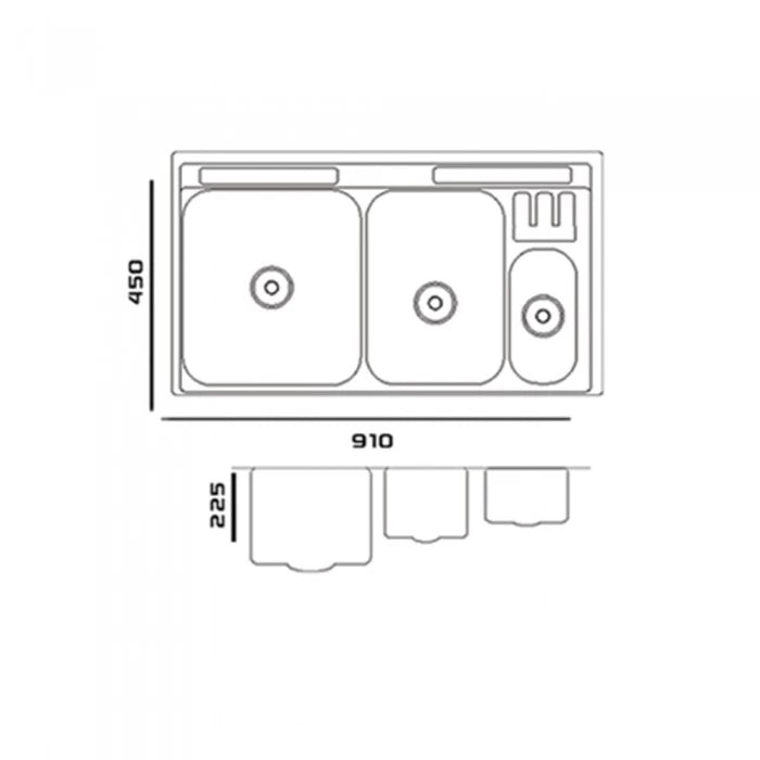 Този модел от матова алпака (инокс) е идеален за големи семейства или за професионално готвене. С общи размери 910x450 мм, мивката разполага с две независими корита, всяко с **изключителна дълбочина от 225 мм**. Можете едновременно да миете и изплаквате или да накисвате големи тави.