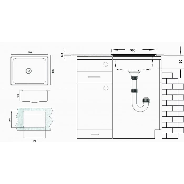 Тази кухненска мивка от алпака (висококачествена неръждаема стомана) предлага перфектния баланс между компактни външни размери (500x420 мм) и **функционална дълбочина (190 мм)**. Това я прави идеална както за стандартни, така и за малко по-малки кухненски шкафове.