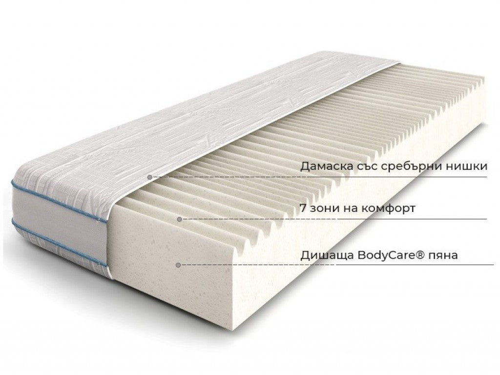 Матракът разполага с ядро от профилирана и дишаща BodyCare® пяна с отворена клетъчна структура, което осигурява отлична проветривост и комфорт по време на сън.