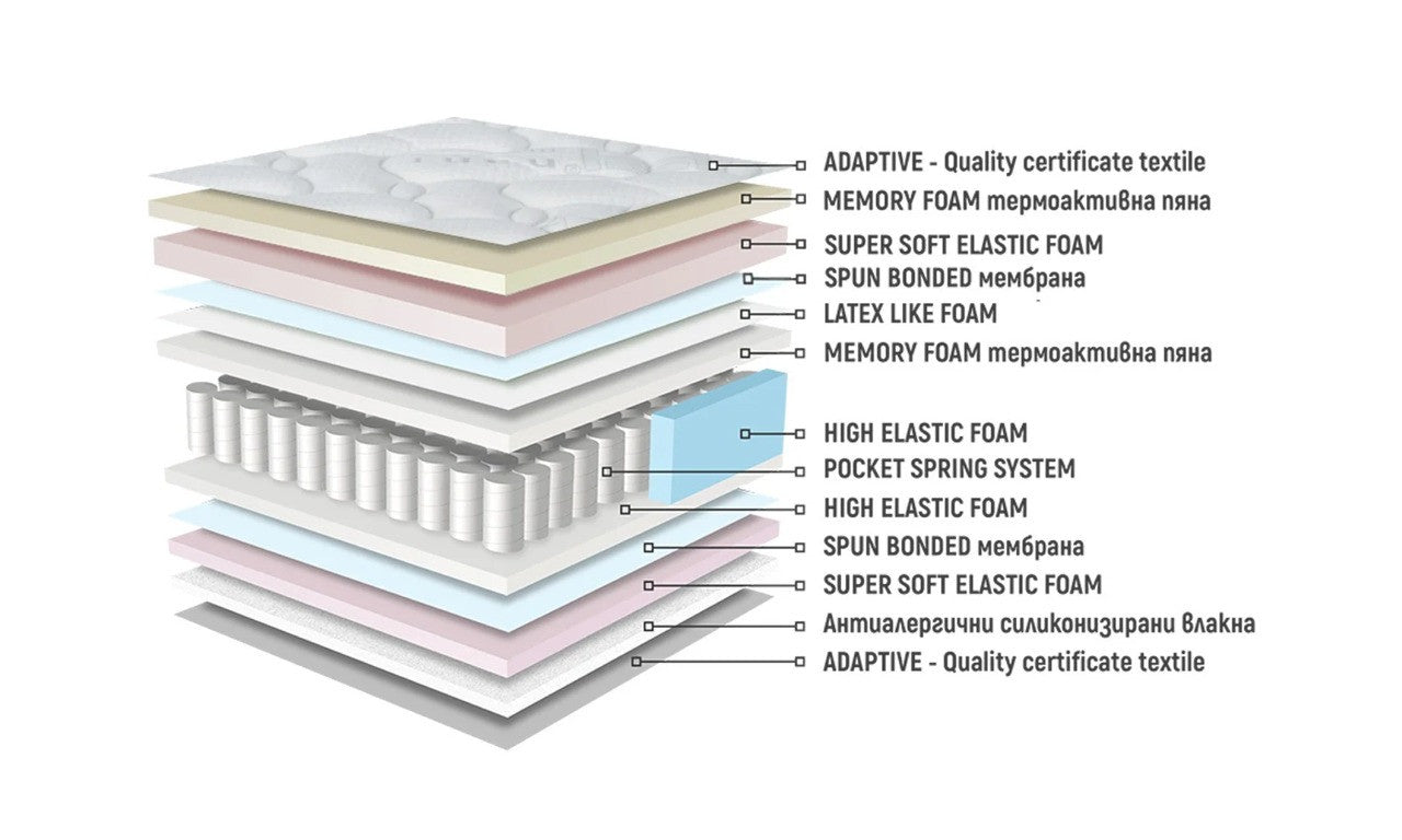 Този модел обединява POCKET SPRING SYSTEM с положителните характеристики на POLYFLEX и MEMORY FOAM. Добавянето на LATEX LIKE FOAM в областта, която идва в контакт с тялото, повдига модела на ново, по-високо експлоатационно ниво. Потребителите често споделят впечатления за комфорт и мекота, съчетани с достатъчна поддържаща сила.