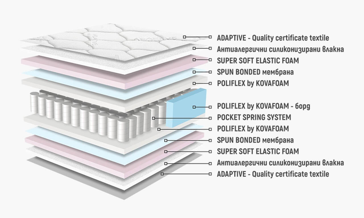 Лекото поклащане при дълбоко и равномерно потъване на тялото определя комфорта на пружинните матраци. Това усещане е характерно и за АРУБА ПОКЕТ, където еластичността и комфортът са в центъра на вниманието. Индивидуално пакетираните в текстилен джоб пружини, закрепени в едно цяло посредством еластична връзка, формират сърцевината на матрака. Единичните пружини с константна височина и брой навивки предоставят гарантирана дълготрайна мекота. За допълнителна устойчивост, баланс и здравина, зоната на сядане е обградена от стабилизираща POLIFLEX рамка с висока плътност. Капитонираният с антиалергични силиконизирани влакна калъф предоставя оптимален термо-ефект, запазвайки топлината на тялото. Естествено мекият сертифициран текстил ADAPTIVE влияе благоприятно върху температурата по време на сън. Вложените висококачествени материали правят АРУБА ПОКЕТ желан и търсен модел сред продуктите за сън.