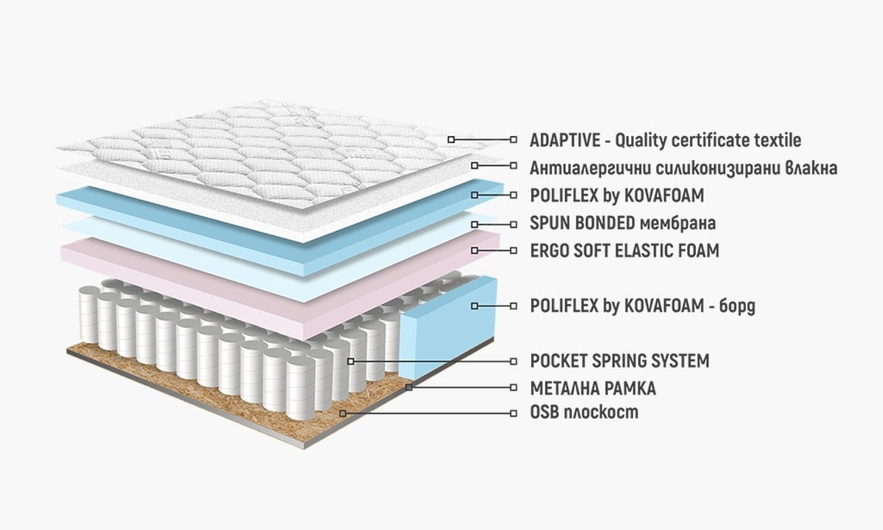 POCKET SPRING ТЕХНОЛОГИЯ И В ЕДНОЛИЦЕВ ВАРИАНТ С МЕТАЛНА РАМКА