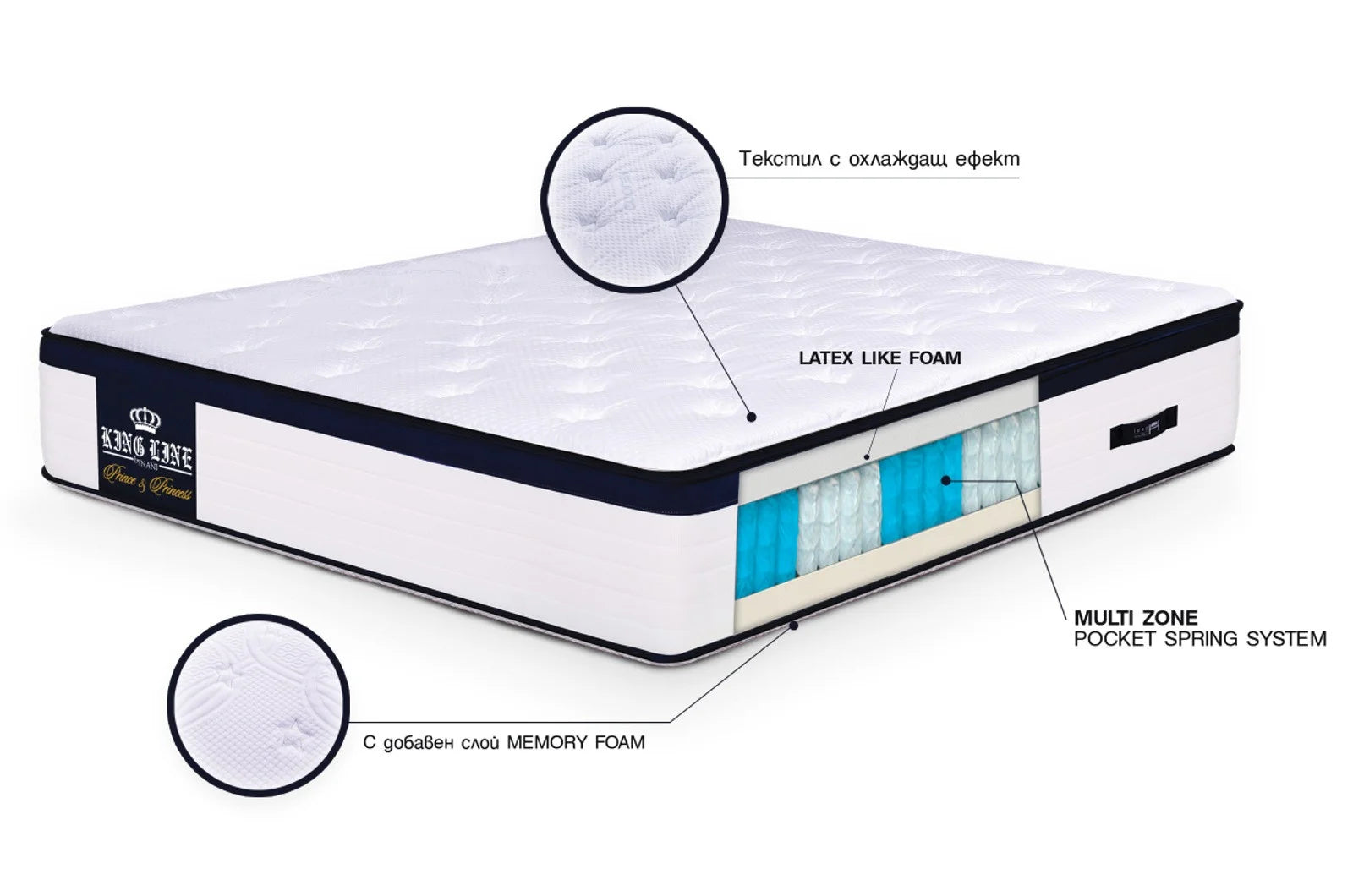 С уникална структура, позволяваща добра циркулация на въздуха, и дамаска, която е капитонирана и охлаждаща от едната страна, а от другата подходяща за летните нощи, този матрак е перфектният спътник за вашия здравословен сън. Не правете компромиси с комфорта - изберете King Line Prince & Princess!"