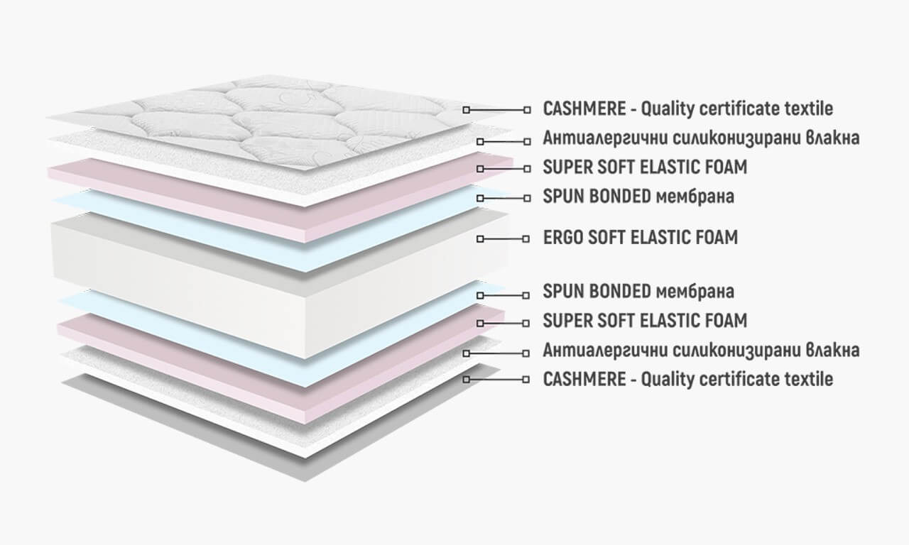 Антиалергичните силиконизирани влакна, съчетани с текстила CASHMERE в прошивката, осигуряват усещане за галещ комфорт. Отворената клетъчна и дишаща структура на избраните материали подпомага вентилацията в дълбочина и повишава здравината.