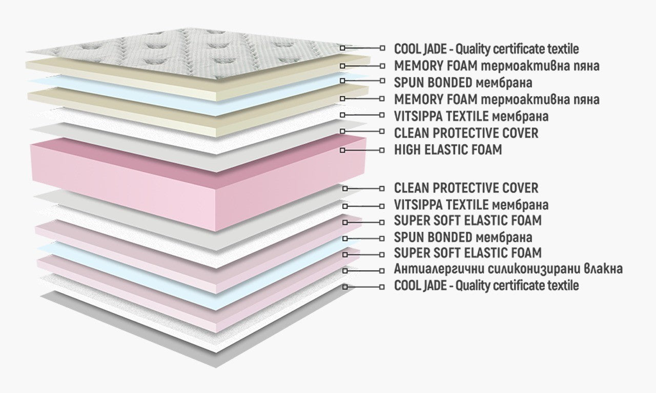 Съставните отворени микро клетки и CLEAN PROTECTIVE COVER осигуряват проветривост и стерилност. Калъфът, заедно с дишащата лента и Cool Fade от BEKAERT DESLEE, придават модерен вид. Делимият цип добавя функционалност и улеснява поддържането на матрака. Комбинацията от висококачествени материали и функционалност го правят предпочитан избор за тези, които ценят здравословен сън. Плътността на MEMORY или мекотата на SUPER SOFT осигуряват специфично усещане за комфорт и релаксация.