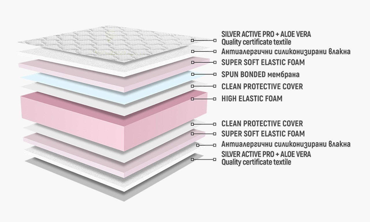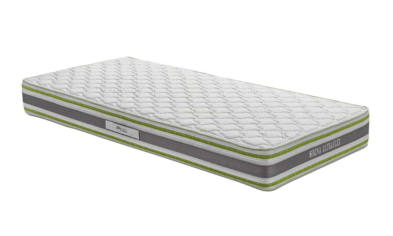 HIGH ELASTIC FOAM осигурява необходимата балансирана ортопедичност, докато в контактната зона с тялото SUPER SOFT ELASTIC FOAM предотвратява точки със свръх напрежение. Сърцевината с отворени клетки и 30-сантиметровата дишаща лента създават оптимална система за максимална проветривост и вентилация на влагата. SILVER ACTIVE PRO + ALOE VERA, заедно с антиалергични силиконизирани влакна в капитонажа, придават завършеност на сваляемия калъф с делим цип. СИРЕНА УЛТРАФЛЕКС е бестселър сред търсещите балансирана ортопедичност при оптимално съотношение между цена и качество.