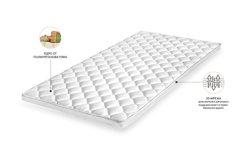 Ядрото от полиуретанова пяна предоставя множество предимства, включително подобрен комфорт, опора и облекчаване на налягането. Тази висококачествена пяна допринася и за намаляване на шума, гарантирайки спокоен нощен сън както за вас, така и за вашия партньор.