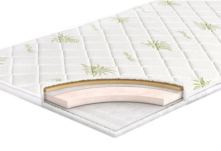 Изключителността на топ матрака Aloe Memo Flex се допълва от висококачествената материя Алое Вера (100% PES), известна с успокояващите си свойства върху кожата и антибактериалните, антимикробни и антисептични характеристики. Също така, вграденият слой мемори пяна в прошивката създава мека повърхност, която следва естествените извивки на тялото, предоставяйки уютна и поддържаща среда за сън.