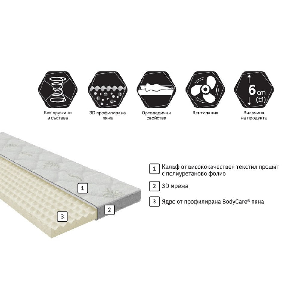 Топ матракът е изграден от дишаща BodyCare® пяна със средна плътност и висока твърдост, устойчива на натиск, натоварване и деформации. Профилирането създава приятен масажен ефект, подпомага кръвообращението и осигурява релаксиране на тялото.