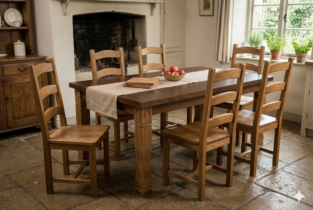 Трапезна маса “Кай” – съчетание на изключителна здравина и елегантен дизайн. Изработена от масивна дървесина с дебели крака, тази маса е създадена да бъде в центъра на вашия дом за години напред.