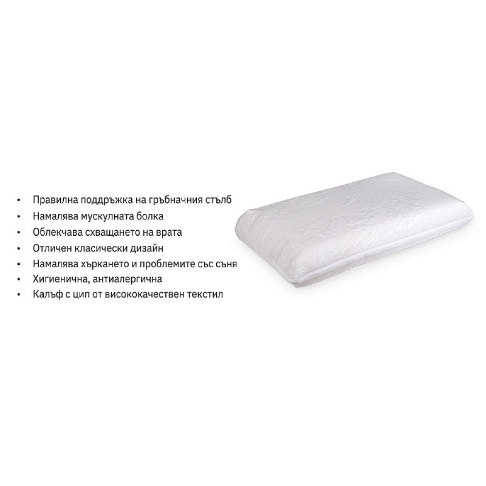 Ако търсите удобна възглавница, която би ви помогнала с безсъние и умора, представяме ви възглавницата Мемори. Тя е направена от 100% високоеластична мемори пяна, която се адаптира към температурата на тялото и приема формата на вашата шия и глава. Гъвкава и удобна по време на сън, тази възглавница освобождава напрежението в шията и осигурява пълноценен отдих. Хипоалергична и антибактериална, тя не дразни кожата, а я поддържа успокоена. Калъфът й е изработен от висококачествен материал с цип за лесна поддръжка.